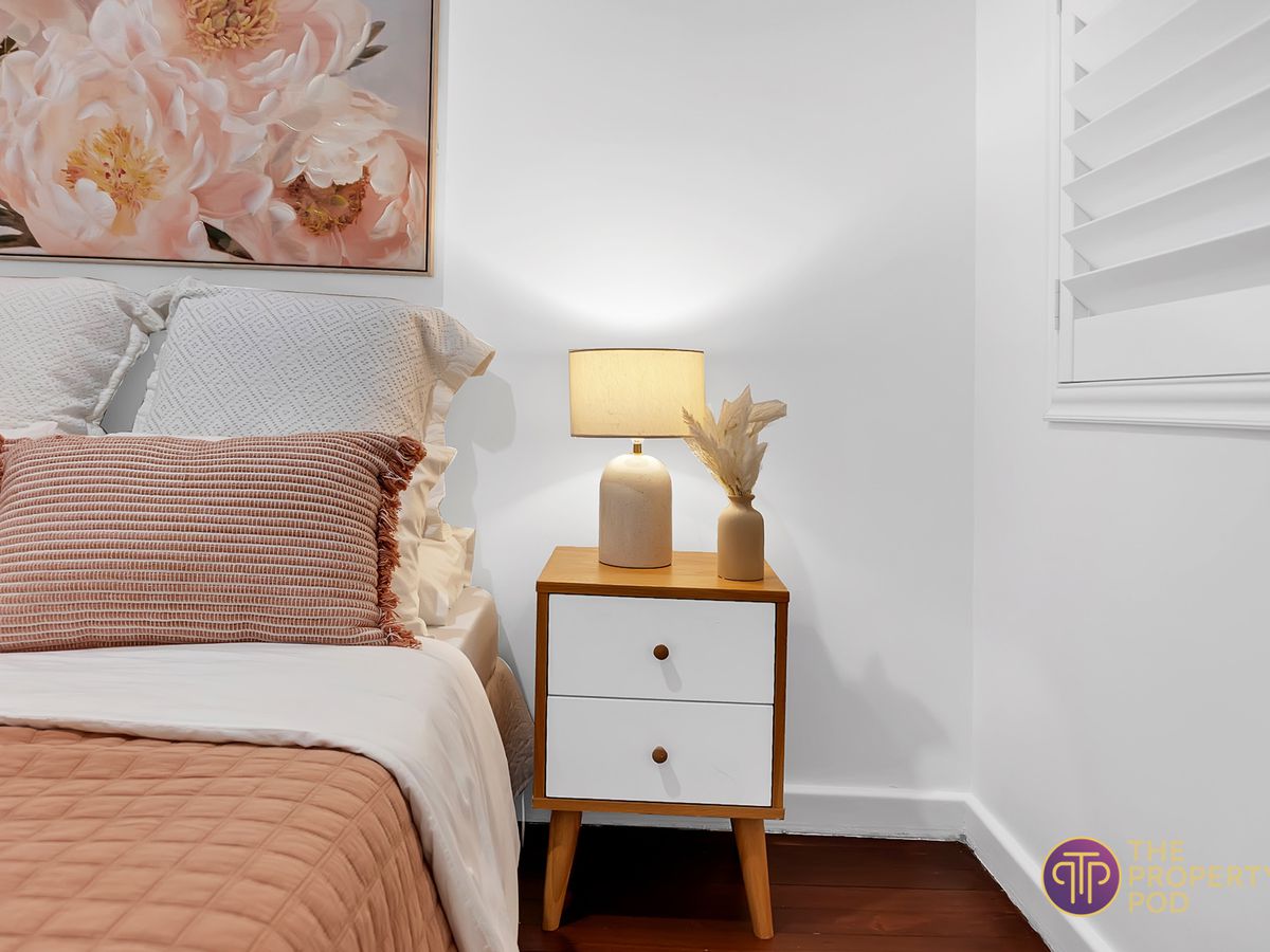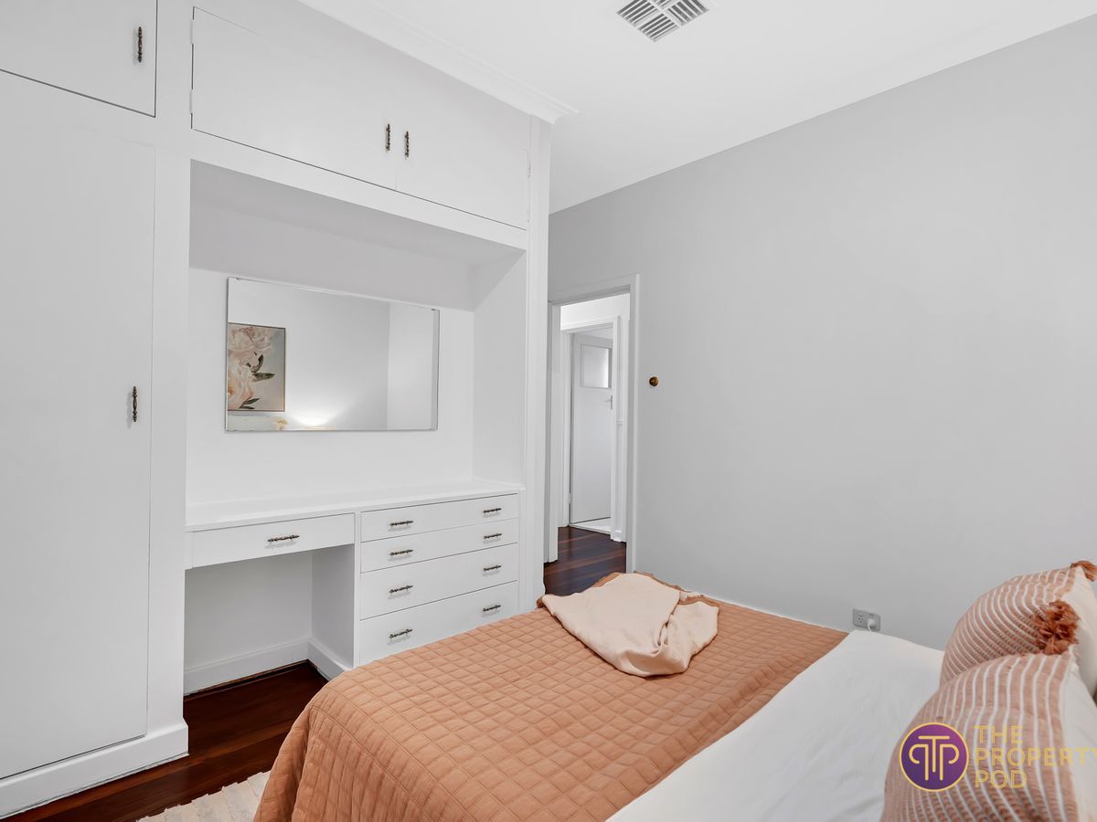 Inside, it has all of the character you would come to expect. Soaring ceilings, original jarrah floorboards in the living area and bedrooms, an open fireplace and decorative ceiling roses. The neutral colour palette's, statement lighting and plantation shutters welcome natural light and give it a bright airy feeling.